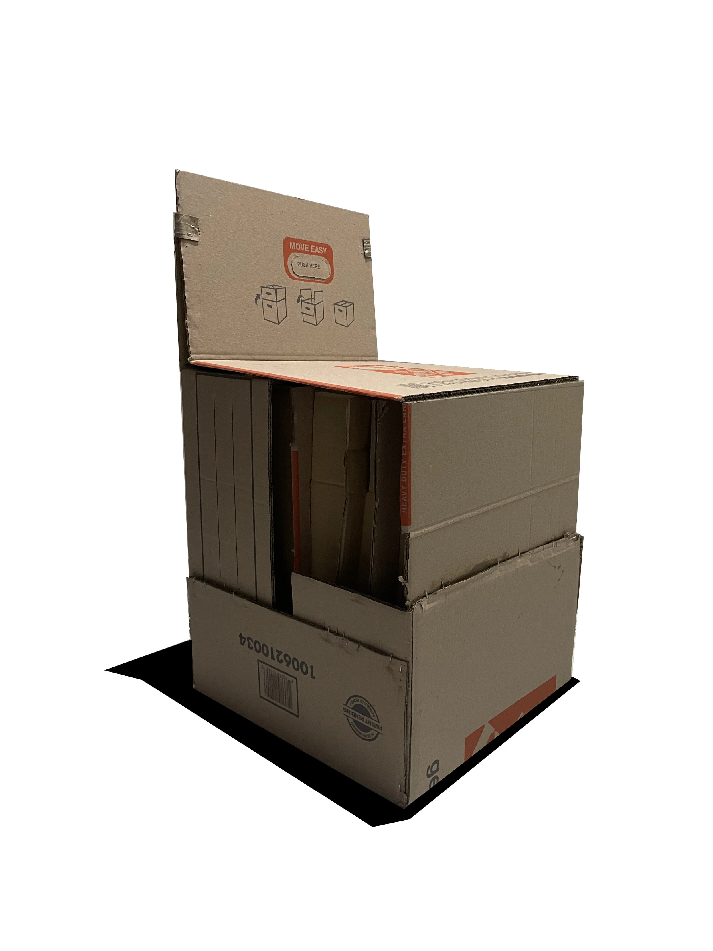 CONSTRUCTED USING ONLY CARDBOARD AND STAPLES, THIS MINIMAL STYLE CHAIR CAN SUPPORT UP TO 240 LBS. DESIGNED INTENTIONALLY WITH OPENINGS ON BOTH SIDES TO SEE THE STRUCTURAL SYSTEM OF THE CHAIR.
